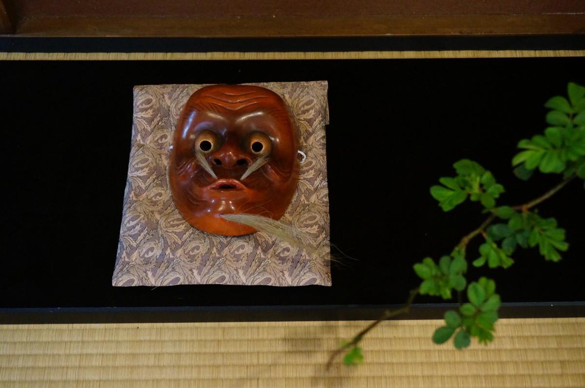 能面はサロンの方々のご協力で、和室の様々な場所にお花と一緒に展示しております。