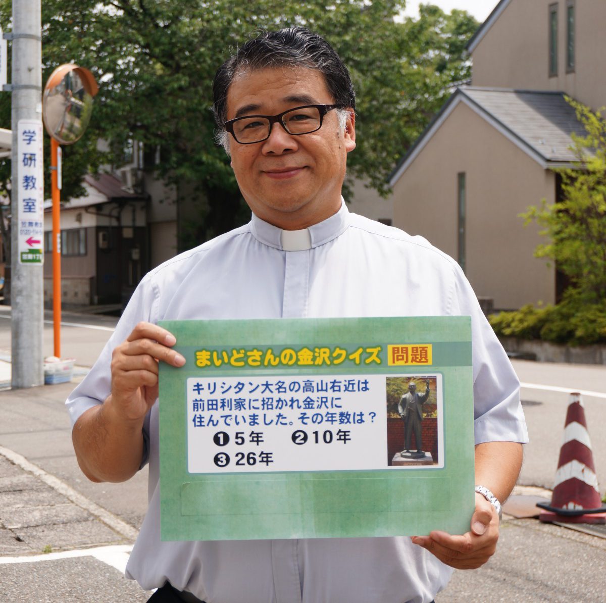 待ち合わせ場所兼収録場所のカトリック教会では、ちょうど高山右近の列福に合わせ彼のことを紹介するバナーが展示されておりました。